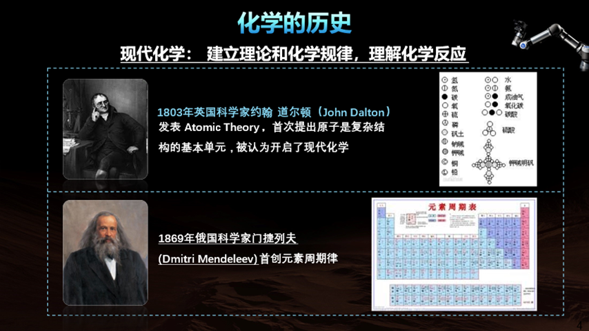 另外,化学还有一个难度叫做“投影式”灾难。人类的思维是有限的,例如生活在三维的物质世界里,人类的思维是超越不了三维的。所以分析问题的时候要抓住主要矛盾,因为人类的大脑只能够承担主要矛盾,矛盾一多大脑就会十分疲惫,这就是典型的思维的限制。我们在理解不了高维的事物时,往往把它投影在不同的低维上,但是投影之后的世界跟真实的世界是相差甚远的。例如上图片右边这样的一个仪器,一个事物投射在不同的方向上,一面是天使、一面是魔鬼,那我们就无法确定这个事物的本质。中国有一个类似事例叫“盲人摸象”,人类在高维世界其实就是个盲人,我们认识这个世界的方式就是“瞎摸”,摸到什么就认为什么是真实的,因为也无法证明,而想要反演回去是非常困难的。现在的化学研究还是依靠简单的办法——“试错式”和“炒菜式”。因为化学是调配的一个结果,需要不断试错,才能从中知晓唯一的正确配方。另外化学跟炒菜也很相似:配料一模一样,一个人就炒得好吃,另一个人就炒得就很难吃;同样的东西有些化学家就能做得非常好,有些就非常糟糕。主要原因是它非常复杂,人类在没有办法掌握所有知识的情况下,我们就把知识分成很多小块,然后把每一小块知识吩咐给不同的人去做。因此我们有了物理、化学、材料和生物等等不同学科。所以人都是生活在知识的孤岛上的。为了解决这一问题,人类做过许多努力,例如《四库全书》、《大英百科全书》,但是没有一个人能把这些知识全都记住。我们再来看实验室的对比,百年前诺贝尔的实验室已经很完备了,再看当今实验室,没有任何进步。现代科技领域很多都已经进入自动化了,而一个教授带着几个学生的这种小作坊的形式太古老了,这种形式是限制现代科学的发展的主要原因之一。还有一个原因是试错的成本是非常高的,而小作坊的形式就会产生低通量。人的精力是有限的,特别在做科学实验的这种高度集中的情况下,延长的时间并不会有额外的产出。其次实验的结果可能跟情绪相关性很大,心情也会影响数据。这些问题是非常复杂的,而人工智能可以解决这些问题。人工智能爆火的原因是它迎合了这个时代,能够为复杂的高维度问题提供一个方案。问题越复杂、它的优势越大,例如人工智能在围棋方面已经远超人类了。