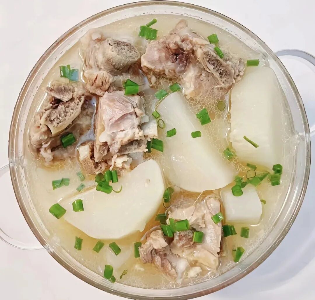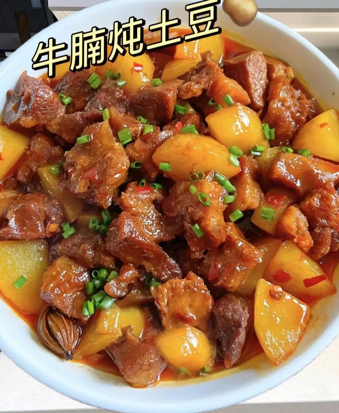 土豆烧牛腩、肉沫花菜、炒绿豆芽、筒骨萝卜汤