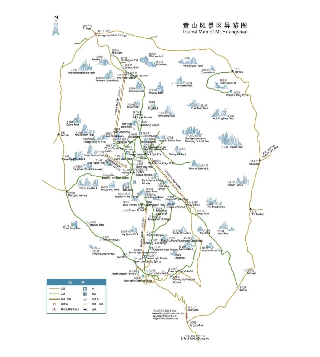线路2:黄山南大门→云谷寺景观区→(云谷索道上行)→始信峰景观区→狮子峰景观区(清凉台、散花坞)→排云亭景观区→西海大峡谷景观区(西海网红小火车)→天海景观区→光明顶→北海中路→(云谷索道下行)→云谷寺景观区→黄山南大门