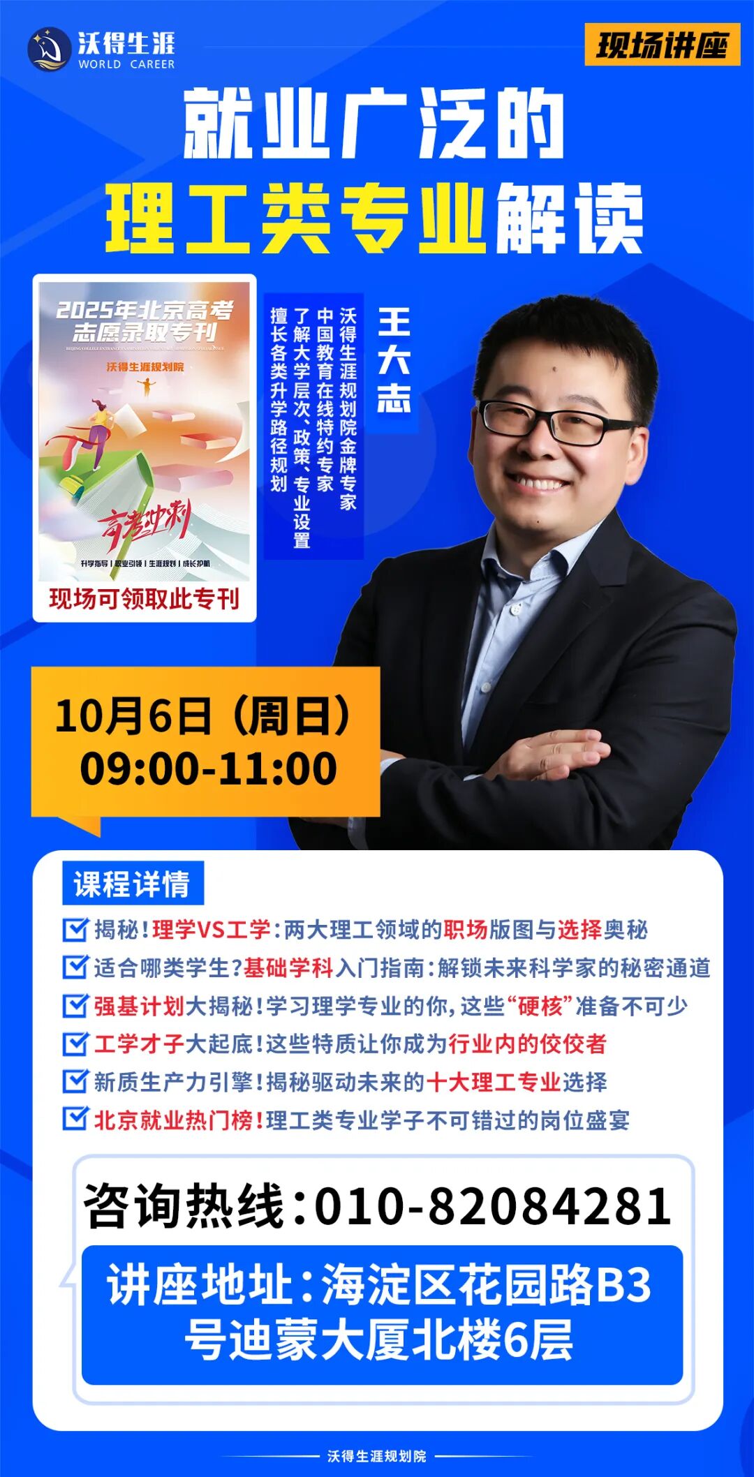 理工科是招生规模最大的专业门类,特别是今年的就业环境和选科要求有所改变的情况下,理工科成为很多同学的首选!哪些专业未来在京好就业?不同分段的同学该怎么选?10月6日(周日)上午9点,王大志老师带您现场详细了解其中的变化和趋势,我们学生家长如何应对决策!一一解读,切勿错过!
