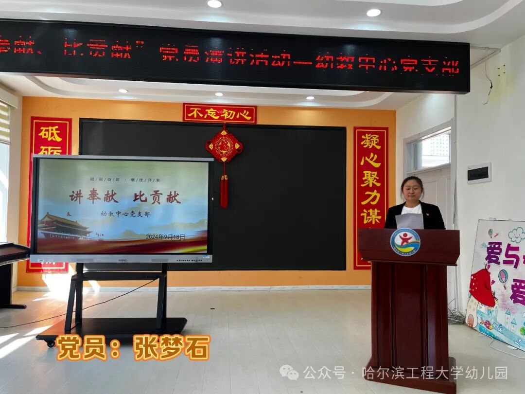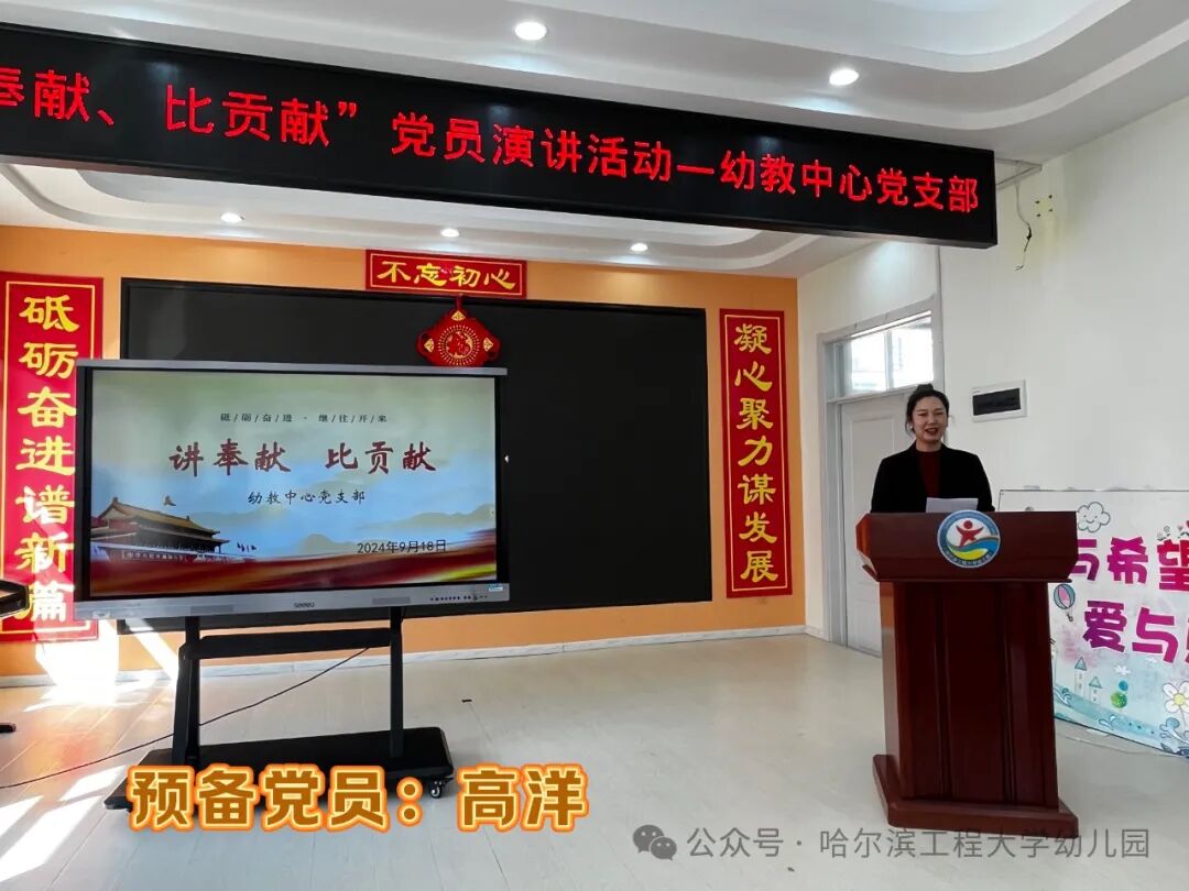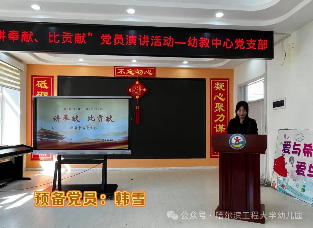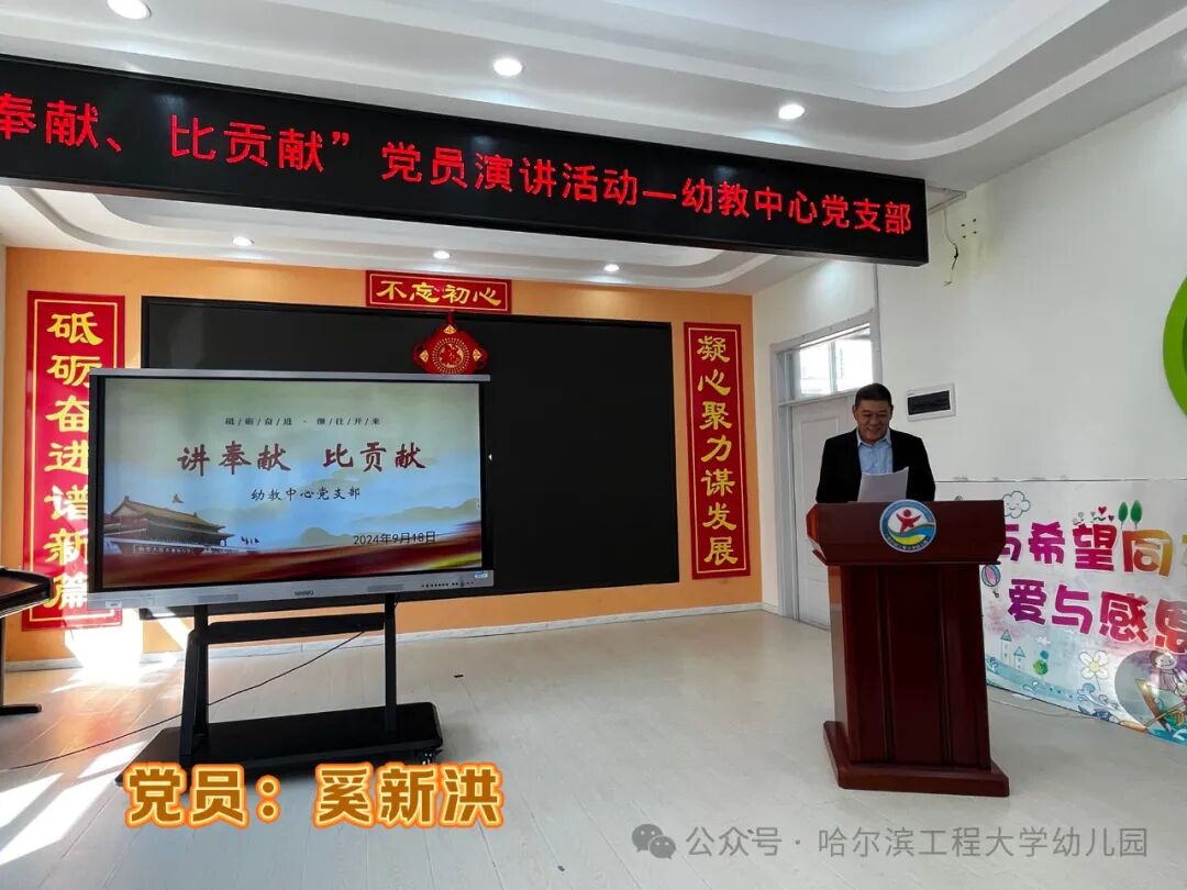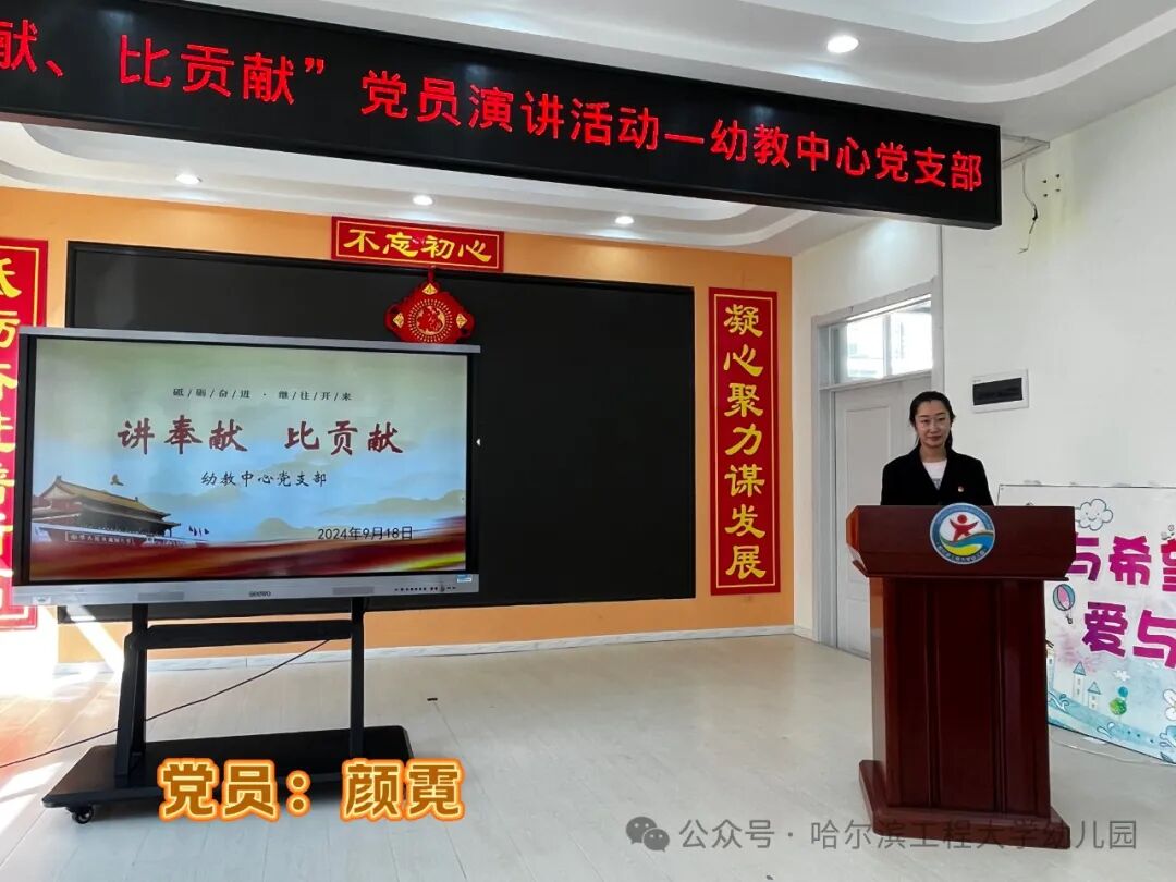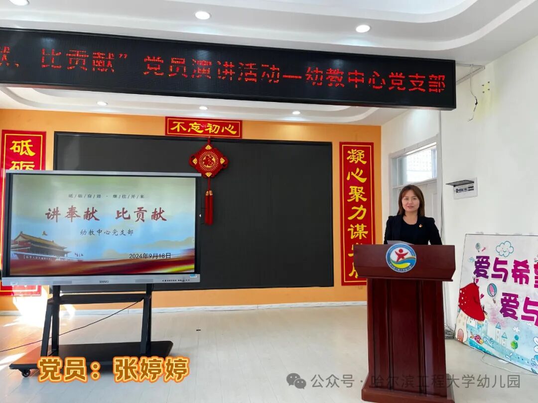 在学习时代楷模的热潮中,近日幼教中心党支部组织开展了以“讲奉献、比贡献”为主题的演讲活动。党支部成员颜霓、高洋、王清华、张婷婷、奚新洪、韩雪、张梦石分别进行精彩演讲,激励全体教师以杨士莪院士为榜样,忠诚于党的教育事业,为培养新时代幼儿贡献力量。