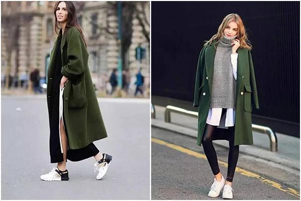 墨绿色的个性风衣,袖口用撞色的搭配,搭配印花打底裤,很个性有型哦, 红色与绿色的撞色搭配,也可以穿的很漂亮。