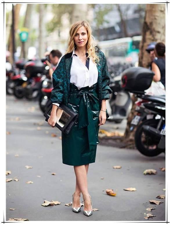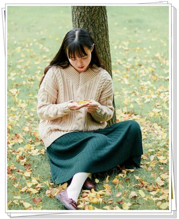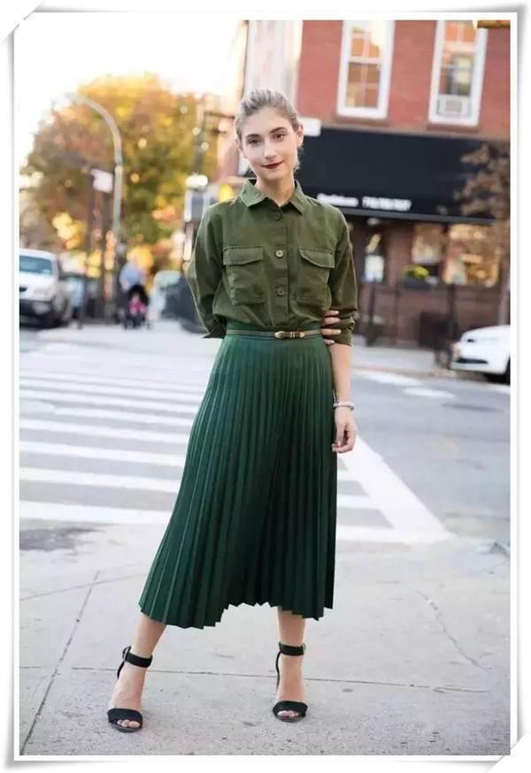 全身都沉浸在绿色调的海洋里,一定是对于绿有着偏执的热爱,通过绿色调的深浅不同的变化,营造了一个春日里充满着浪漫情怀的少女形象,尤其是墨绿色半身百褶裙,在这个不冷不热的季节,长度刚刚好,宽大的裙摆可以有效的修饰不完美的身形。