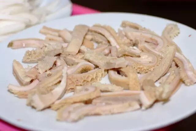 在中国菜中“肚领”是牛肚的上等品,非常嫩,容易嚼。小新听说爆肚厨师将肚领一分为三,最后者叫“大梁”,把大梁去膜剥皮,剩下的又白又厚芯被称为“肚仁儿”,是肚领中的极品,最好的部位,口感比较韧。