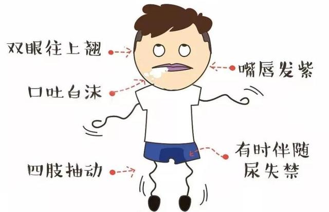 4.大发作:出现意识丧失、跌倒在地,眼球上翻或凝视,四肢强直; 全身抽搐、口吐白沫、还会出现牙关紧闭和大小便失禁等。
