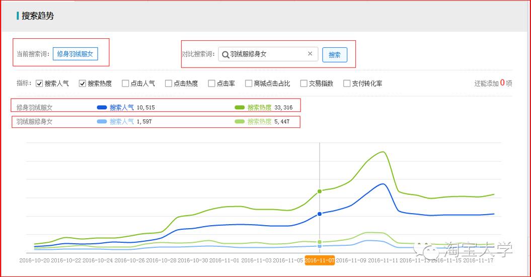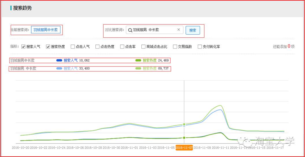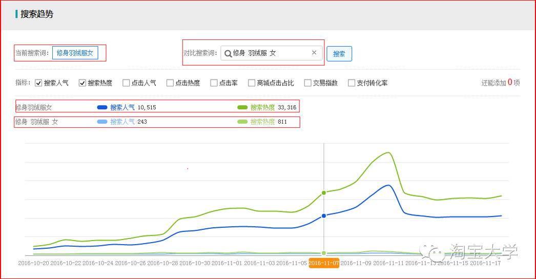 答案很明显是不一样的:“修身羽绒服女”搜索人气10515,搜索热度33316;“修身 羽绒服 女” 搜索人气243 搜索热度811,一个空格变化就这么大!