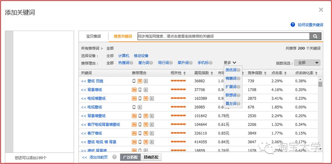 在直通车“添加关键词”一栏中可以选择热搜词、潜力词、同行词、飙升词、带有手机标的词、质优词、锦囊词、拓展词、联想词、置左词等。直通车选词也是很不错的地方,值得推荐。