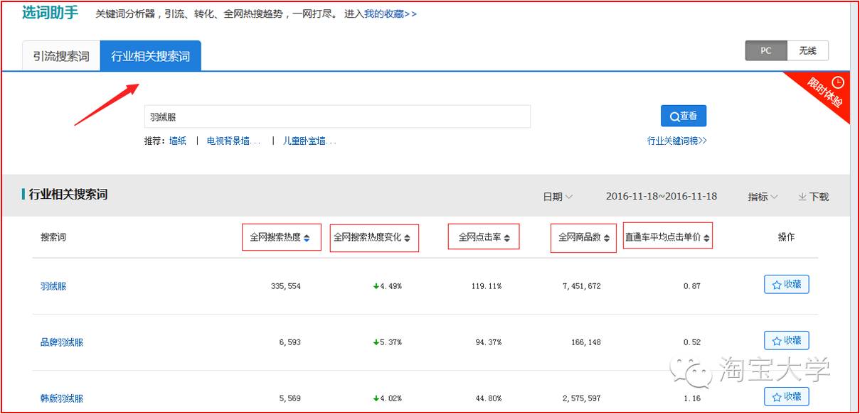生意参谋中的选词助手可以查看行业相关搜索词,功能是非常的强大,可以查看“全网搜索热度、全网搜索热度变化、全网点击率、全网商品数、直通车平均点击单价”等。