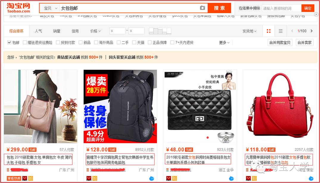 滥用一些关键词的话,轻者会被降权屏蔽搜索,严重者扣分处罚,所以在组合标题的时候一定要注意有些词是不能乱用的。比如现在广告法命令禁止使用的词,举例:极致、全网第一、最佳、国家级、大牌、金牌等,新手在做标题的时候建议先普及下广告法,避免出现因违反广告法的情况被扣分。有些小伙伴在写标题的时候喜欢用“包邮”这个词,包邮这个词基本上是没什么作用的,为什么呢?因为当你的宝贝设置全国包邮的时候,即便标题中没有包邮这个词,在买家搜索“包邮”时也会展现你的宝贝;相反,如果你设置的是部分地区包邮,那么即使标题中出现“包邮”这个词,买家搜索的时候也不会展现你的宝贝,所以写标题的时候建议尽量别用包邮这个词了,属于浪费资源位。参考下图,搜索“女包包邮”出现的宝贝标题中并没有出现包邮,但是还是被展现搜到了↓↓↓