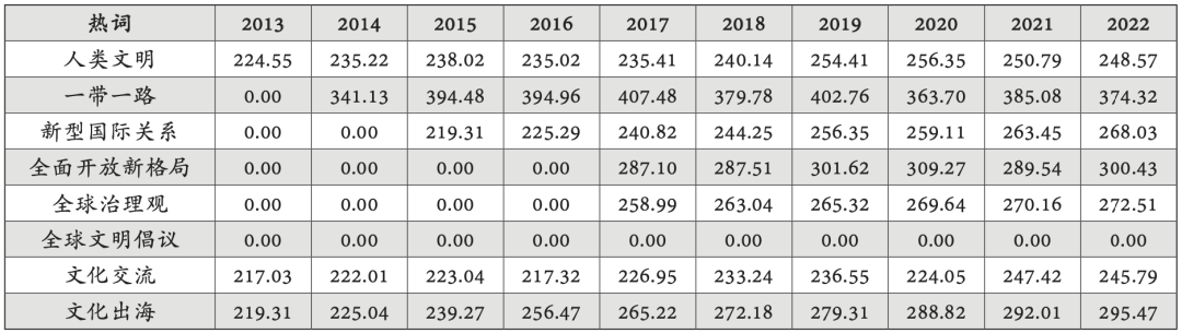 由于本组一些名词提出较晚,因而热度指数以几个关键节点为界,呈现出显著不同的时间阶段。“人类文明”“文化交流”“文化出海”是出现时间相对较早且持续获得关注的3个热词。