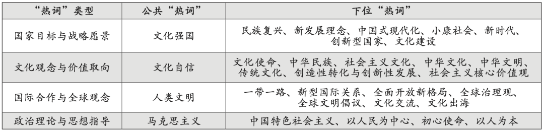 第一,新时代重要理念相关“热词”。本文筛选的“热词”主要来源于十余年来党和政府关于人民文化实践的相关政策文件,以及对国家主流媒体相关报道的词频分析,共同构成新时代重要理念相关“热词”体系(如表1所示)。
