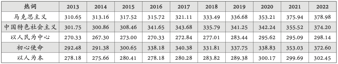 第四,对“政治理论与思想指导”的热词指数分析。这一组关键词包括公共热词“马克思主义”及其相关热词“中国特色社会主义”“以人民为中心”“初心使命”“以人为本”。热词指数测算如表6所示。