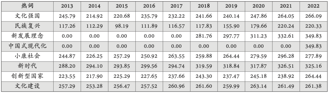 人民文化实践是中国特色社会主义文化实践的生动呈现。“热词指数”可以反映党的十八大以来,以习近平文化思想为统领的新时代文化观被广大人民群众接受和践行的过程。通过“热词”指数化研究,我们可以对这一过程进行精准的测度,以体现新时代文化观对人民文化实践的引领和塑造作用。