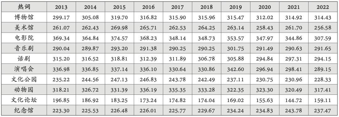 “博物馆”“美术馆”“音乐剧”“话剧”“文化公园”“动物园”等热词在过去10年均保持着较为稳定的关注度。这些热词所代表的各类文化机构或文化设施让文化活动深入公众的日常生活,为中华文化的展示和传播提供了平台。