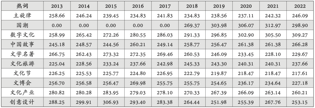 需要说明的是,受限于数据可获得性,本文采用的并不是对2013—2022年所有人民文化实践领域的全样本抽样分析方法,而是聚焦与人民日常生活相关的主旋律文化“热词”,其主要来源于对当下人民文化实践热点和焦点领域的回溯。本文所呈现的是当下较为热门的人民文化实践词汇的历史关注变化趋势,选择的是“以当下观照历史”的研究进路。