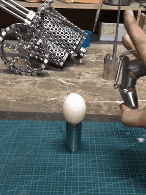视频中,他用不锈钢和弹簧制成的中指指套弹碎了一个玻璃水杯,另一个生鸡蛋则被他弹碎并飞出十厘米。