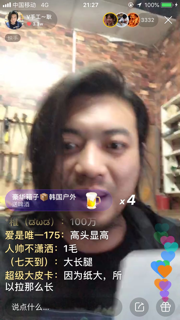 10月20日晚8点半,在先逗了这么一段开场白后,耿帅在快手上的直播开始了。他穿着蓝色牛仔工装裤,披一件黑色夹克衫,捆长发的黑色皮筋松了,他任由其余的头发凌乱披散。