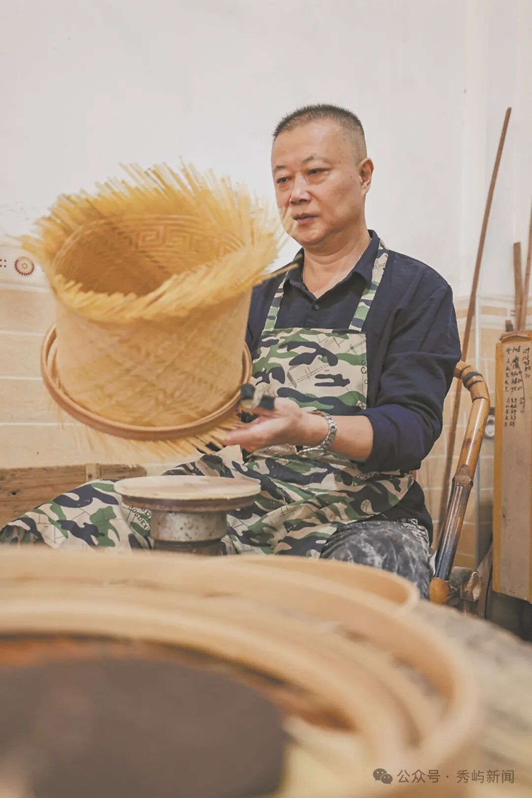 由秀屿区清塘大道驱车,拐上一条村道,不多时便来到了笏石镇下郑村。村内石厝、洋楼星罗棋布,悠长的巷弄中,忽有一位白发老者骑着老式自行车,载着一大把竹篾经过,顷刻间,这个远近闻名的“竹编村”一下子就具象了起来。竹编是我国传统的手工艺。竹子因其独特的弹性、韧性与防水性能,从古至今被劳动人民用于制作各种农具用具,从竹屋茅舍到生活用品,随着社会文明的向前发展,竹编制品越来越精细美观,种类也日渐繁多,因与日常生活密不可分,竹编技艺得以作为历史悠久的“指尖艺术”流传至今。在下郑村,竹编起源已久,约有300年的历史。这个既不靠山也不产竹的沿海小村庄,曾在上个世纪八九十年代间,凭着竹编行当一跃成为十里八乡闻名的富裕村,甚至早早办起了村工厂,小到香皂盒,大到篮、盘、盆、筐、笼,只要给样式就能生产。村里的老人告诉记者,在自己太爷爷的那一辈,竹编就已经是村里一项家家户户都掌握的传统技艺,那时候下郑村出产的竹编制品,是走俏市场的“硬货”,因做工扎实、细节考究,不少周边省市的游客都慕名前来求购,农民既务农又做工,不用离家就能解决就业问题。陈国童在制作竹编。陈剑伟 摄