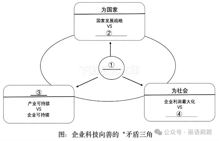 4. 学习小组准备以材料一为基础绘制一张企业科技向善的“矛盾三角”图。假如你是小组代表,请完善这张思维导图。(每空不超过8个字)(4分)