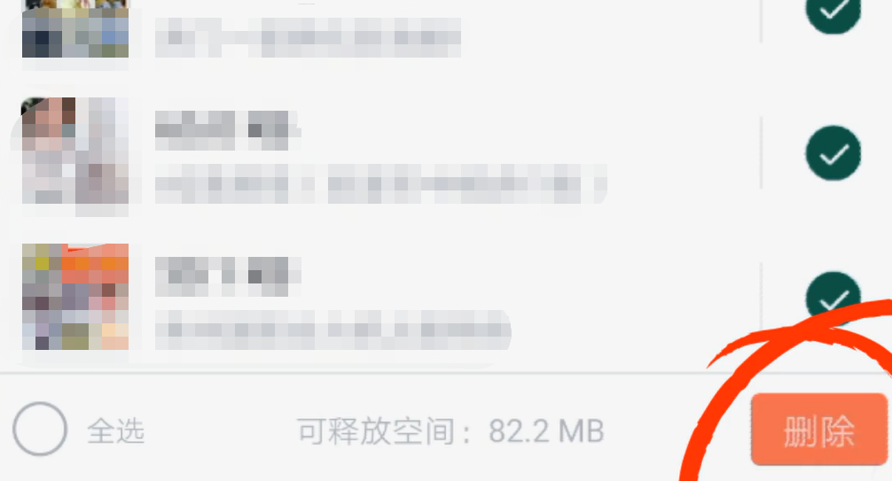 现在我们打开压缩包,这里就是我没有清理过的所有压缩包,现在我们把它清理掉,用手长按住压缩包这两秒按好之后,后面这里它就会出现方框,现在我们需要把它全部删除,点击右上角这里的对勾。现在所有的压缩包都已经选上啦。我们点击下面的删除,出现方框之后,我们再点击删除,这样我们就已经把所有的压缩包给删除好了。