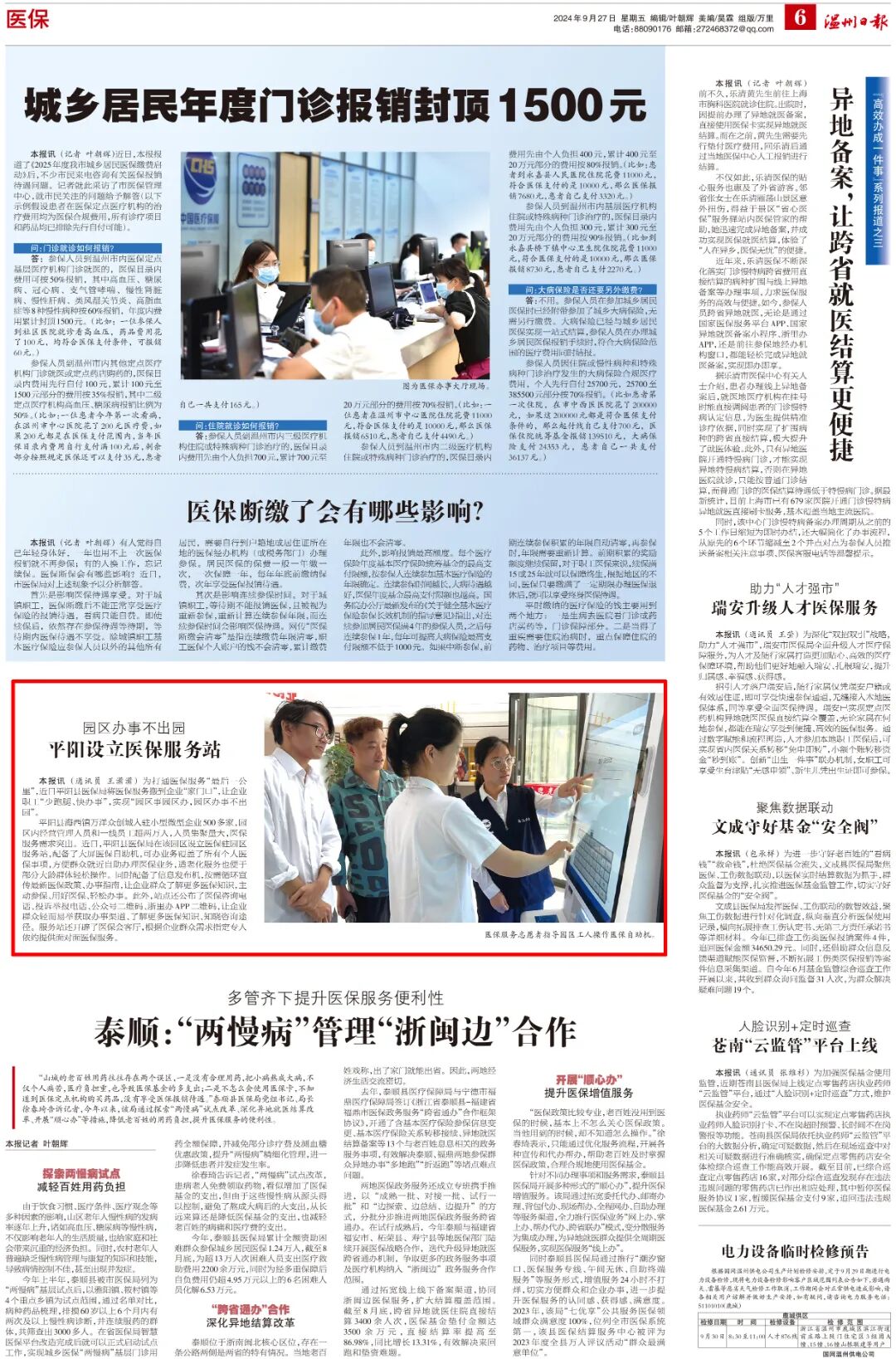 9月27日,《温州日报》6版报道《园区办事不出园 平阳设立医保服务站》