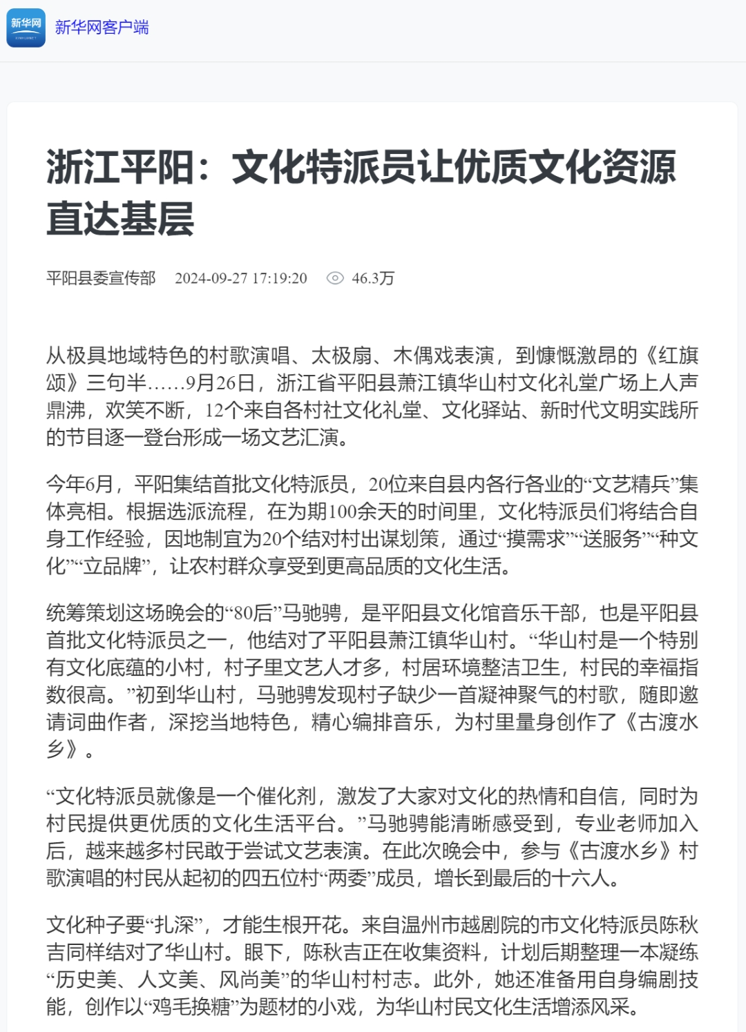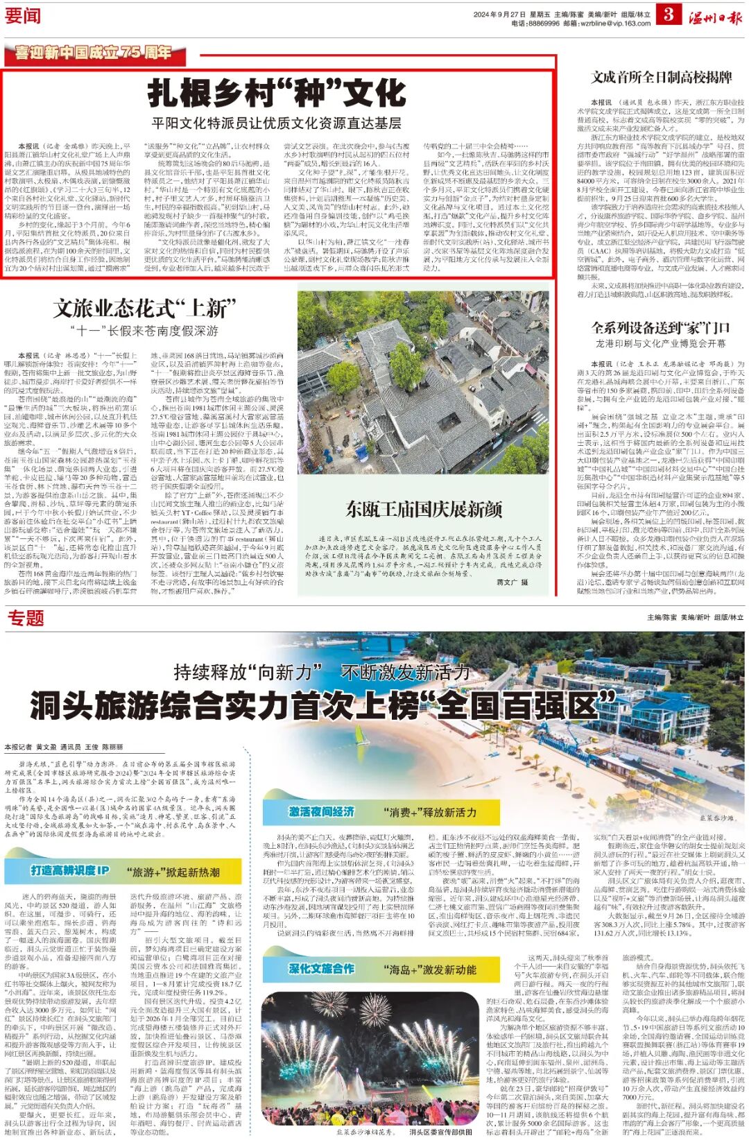 9月27日,《温州日报》3版报道《扎根乡村“种”文化 平阳文化特派员让优质文化资源直达基层》