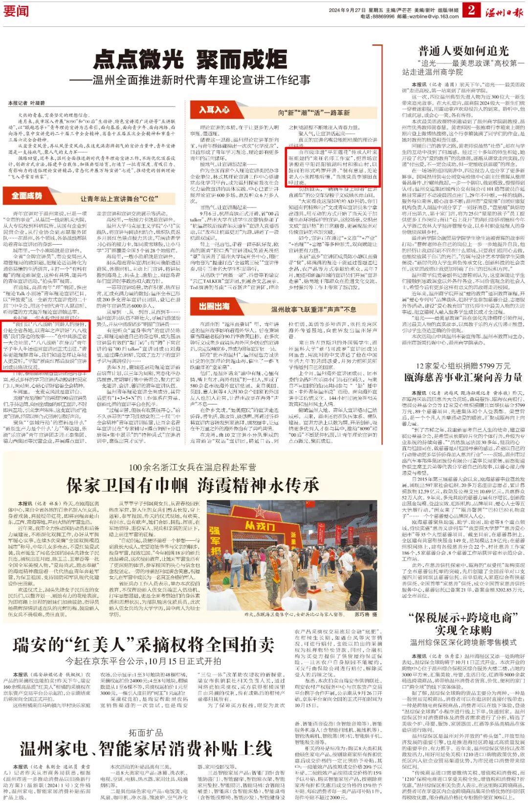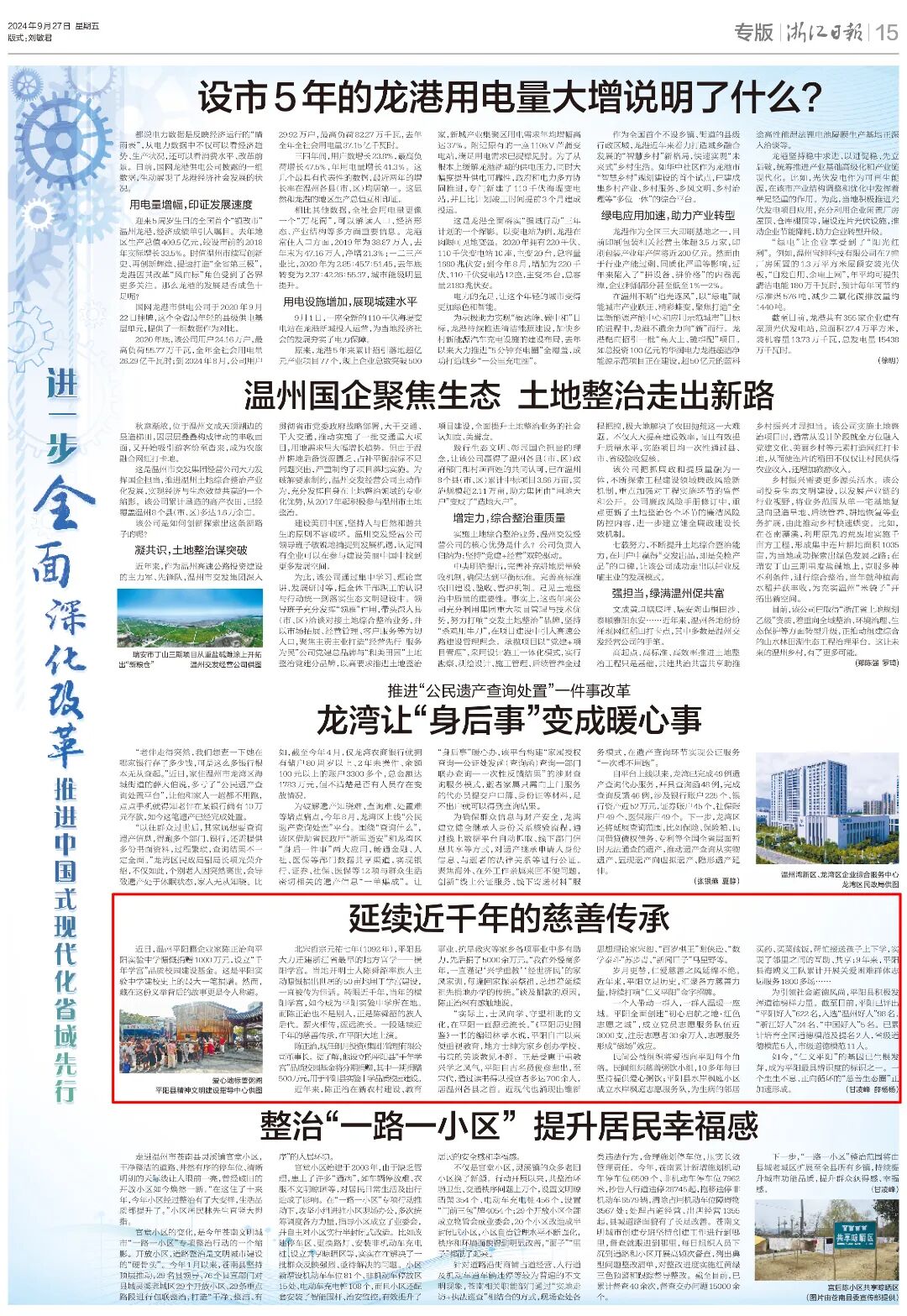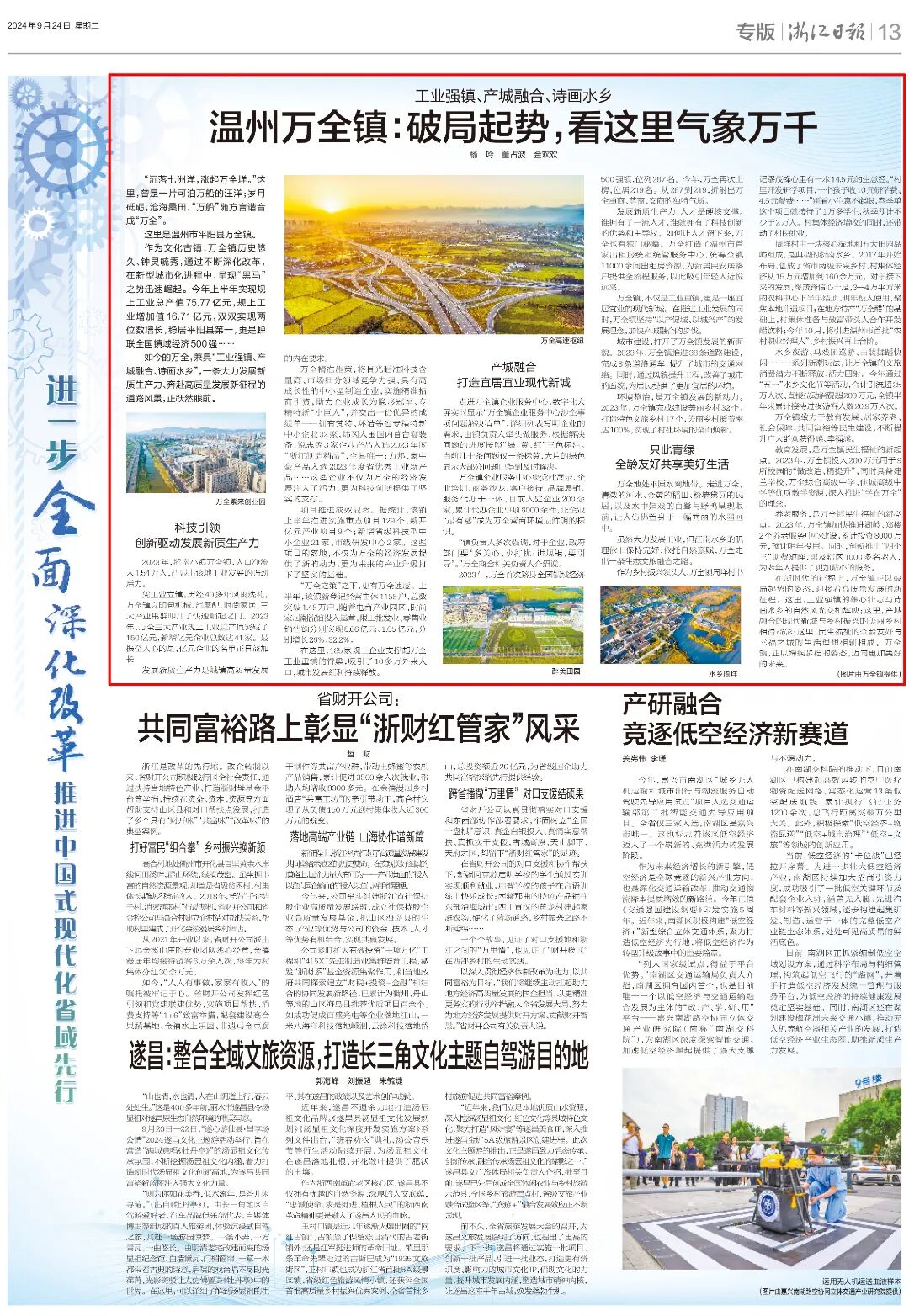 9月24日,《浙江日报》13版报道《工业强镇、产城融合、诗画水乡 温州万全镇:破局起势,看这里气象万千》。