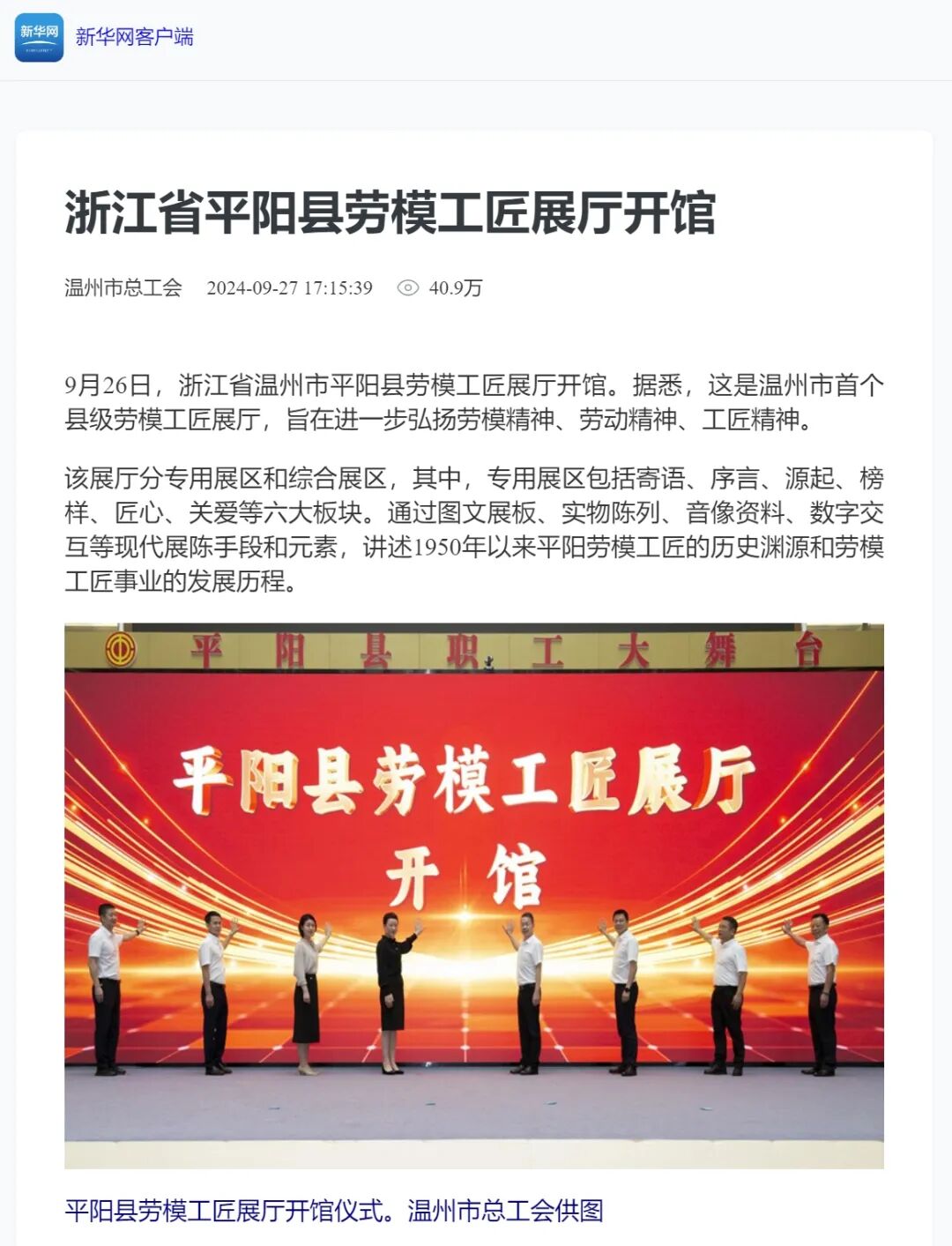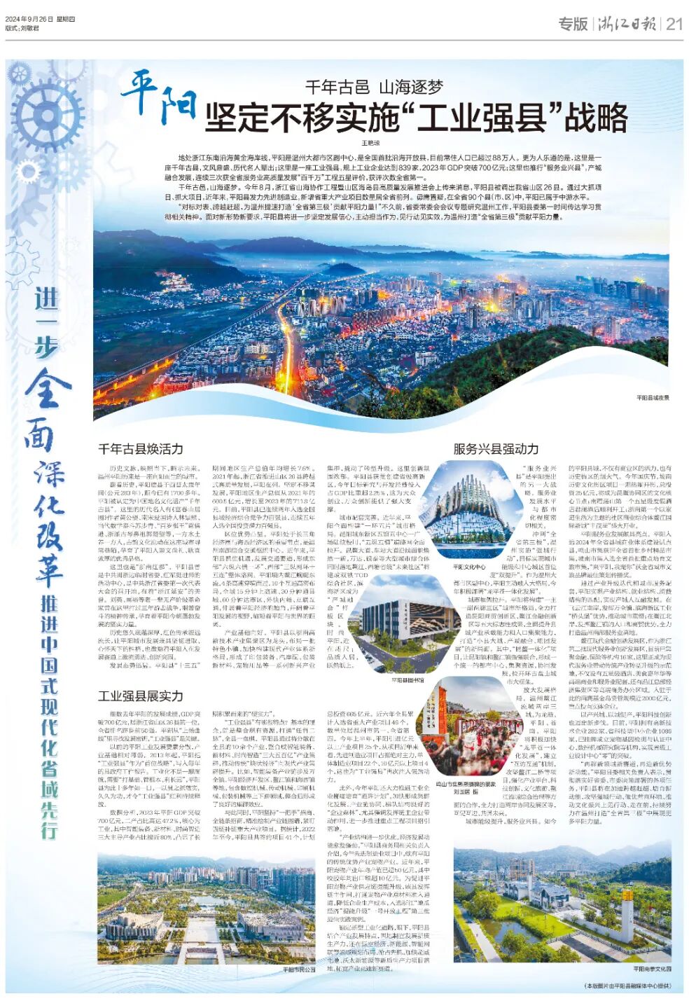 9月26日,《浙江日报》专版报道《千年古邑 山海逐梦 平阳 坚定不移实施“工业强县”战略》
