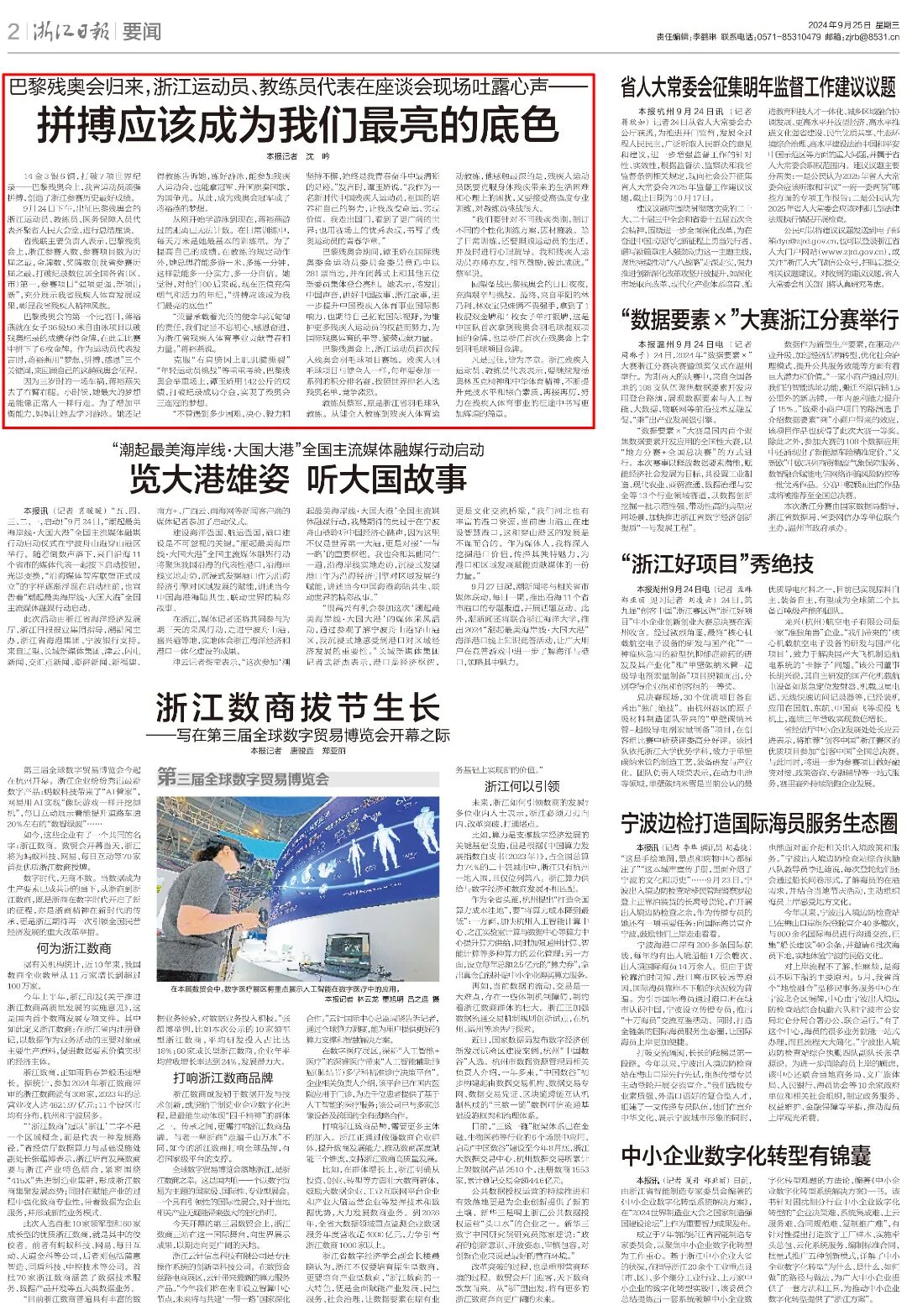 9月25日,《浙江日报》2版综合报道《巴黎残奥会归来,浙江运动员、教练员代表在座谈会现场吐露心声——拼搏应该成为我们最亮的底色》(来自平阳的林乃利、林双宝兄妹俩不畏强手,拿到了1枚混双金牌和1枚女子单打银牌)