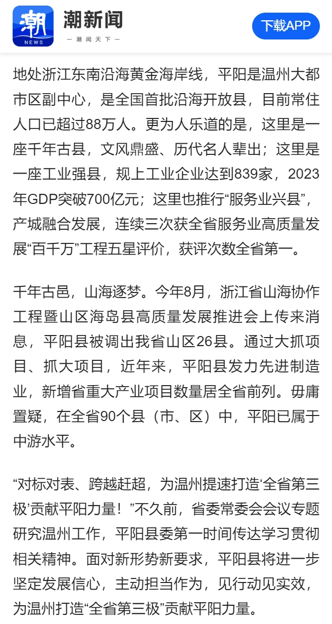 地处浙江东南沿海黄金海岸线,平阳是温州大都市区副中心,是全国首批沿海开放县,目前常住人口已超过88万人。更为人乐道的是,这里是一座千年古县,文风鼎盛、历代名人辈出;这里是一座工业强县,规上工业企业达到839家,2023年GDP突破700亿元;这里也推行“服务业兴县”,产城融合发展,连续三次获全省服务业高质量发展“百千万”工程五星评价,获评次数全省第一。