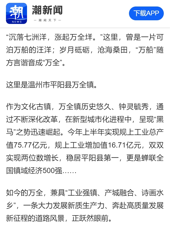 作为文化古镇,万全镇历史悠久、钟灵毓秀,通过不断深化改革,在新型城市化进程中,呈现“黑马”之势迅速崛起。今年上半年实现规上工业总产值75.77亿元,规上工业增加值16.71亿元,双双实现两位数增长,稳居平阳县第一,更是蝉联全国镇域经济500强……