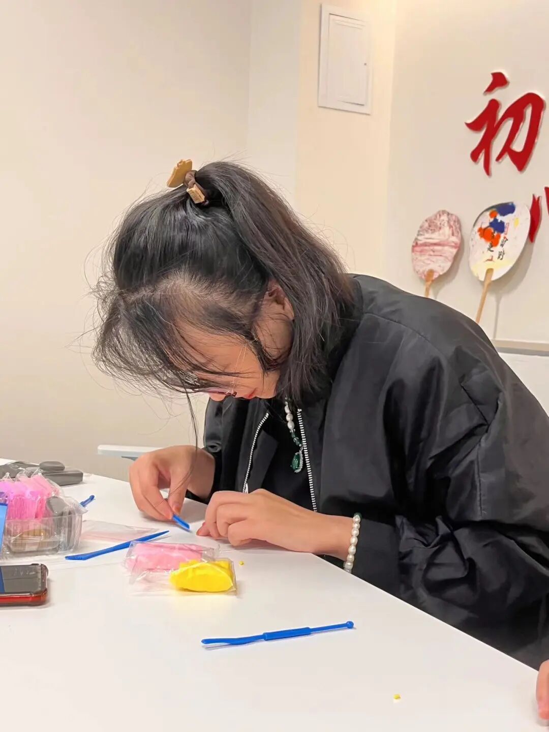 上午10时整,活动在“棠心”一站式学生社区正式拉开帷幕。此次活动内容包括漆扇制作、国庆主题剪纸、黏土雕塑以及簪花等多项传统文化内容。我们还特别邀请了小森林手工社的老师进行指导,助力了活动顺利开展。