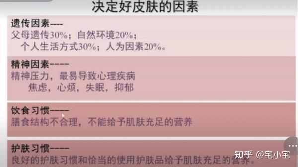 从图上看到,决定好皮肤的因素分别为遗传、生活方式、环境和护肤手段。遗传因素我们没法改变,生活环境我们没法预判,但我们可以改变生活方式和护肤手段。