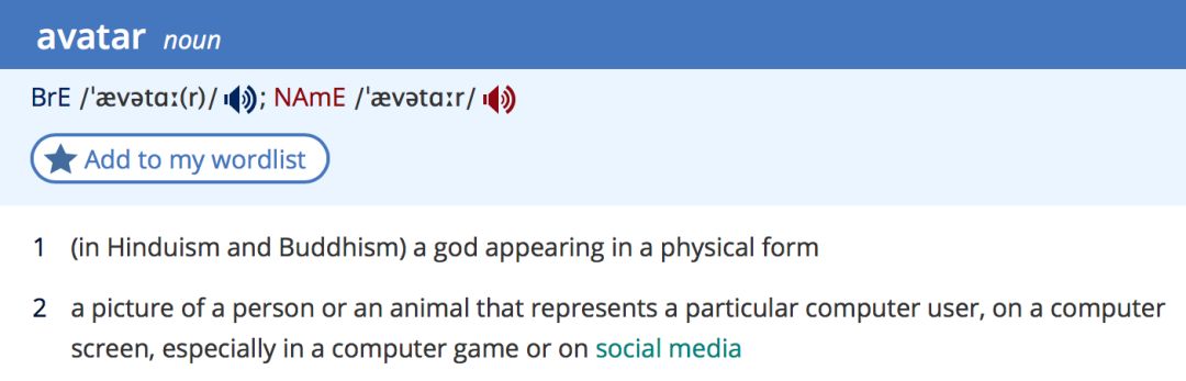 看到这个词,大家是不是想到了卡梅隆导演的神作《阿凡达》?没错,电影《阿凡达》的英文名字就叫做—Avatar。“阿凡达”是avatar的音译,avatar的本义是: