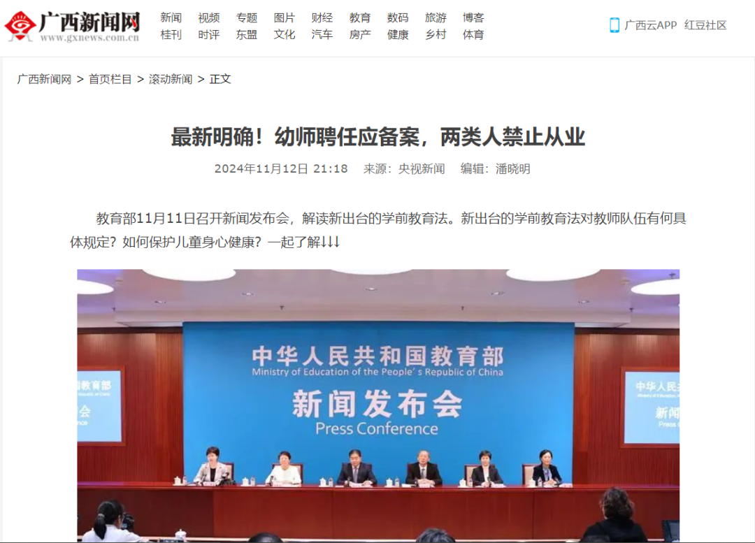 教育部11月11日召开新闻发布会,解读新出台的学前教育法。新出台的学前教育法对教师队伍有何具体规定?如何保护儿童身心健康?