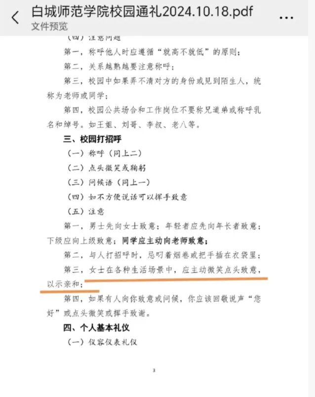 今天,吉林省白城师范学院的一份《校园礼仪规范》征求意见稿引发了社会的广泛关注和热议其中,“女士在各种生活场景中,应该主动微笑点头致意,以示亲和”“女生发色宜为黑色”“不染指甲或染成肉色”等表述引发热议