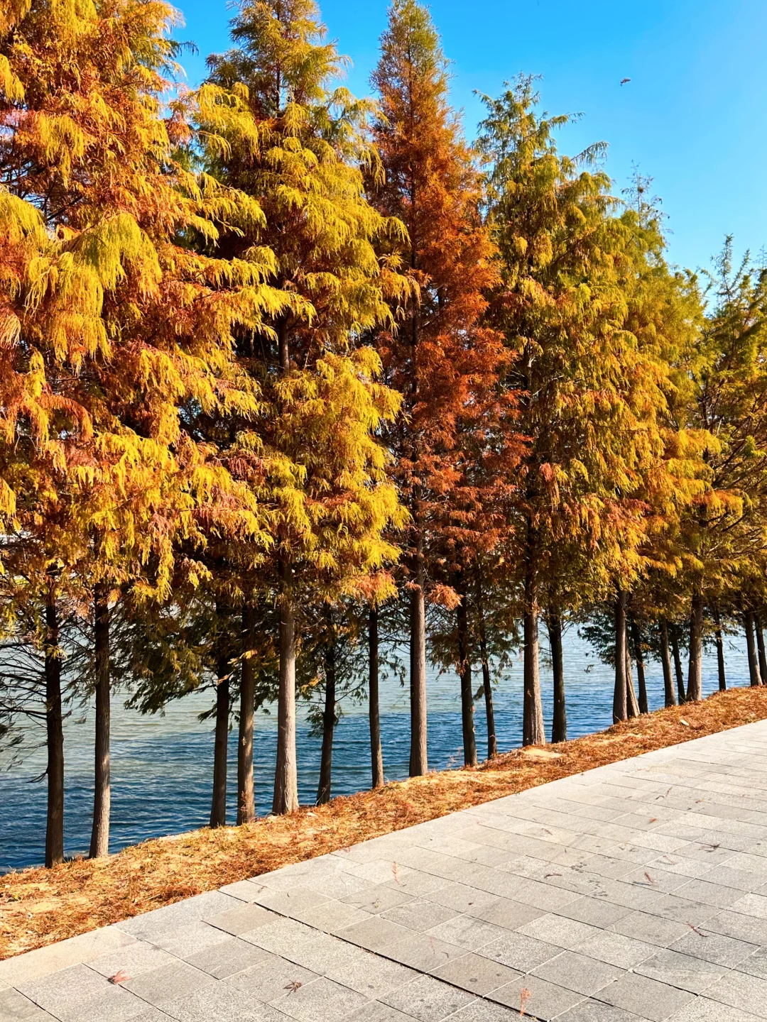 红艳艳的落羽杉静静地矗立在湖边,和波光粼粼的湖水交相辉映,