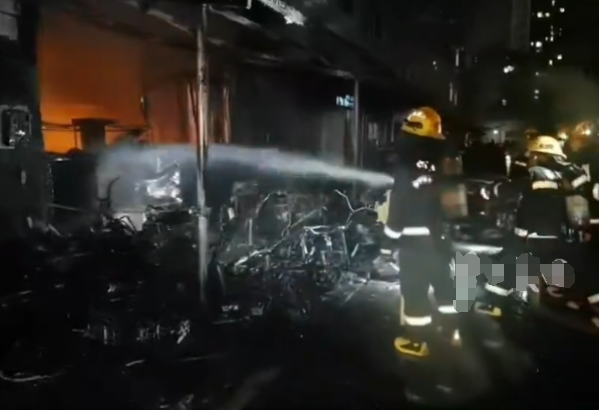 据悉,火灾原因为室外电动车自燃并引燃商铺广告牌,火灾波及旁边停放的电动车和4间店铺门面,共烧毁25辆电动自行车。