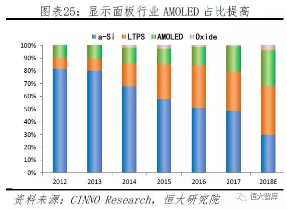 在AMOLED市场,三星目前维持垄断地位,国内厂商正在追赶。从技术分类来看,显示面板可以分为LCD(液晶显示)和AMOLED(有机电激光显示即柔性显示)两大类。LCD又包括α-Si(非晶硅)、LTPS(低温多晶硅)与Oxide(氧化物半导体)。对比传统的LCD技术,AMOLED屏幕具有广色域、高色彩度、轻薄、省电等特性,被称为下一代显示技术,因此自2012年开始由三星主导在高端机型中用AMOLED逐渐替代LCD。2018年上半年,α-Si出货占比降至42.9%,AMOLED份额不断提升至20.4%。