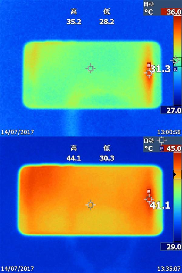 将石墨贴纸贴在手机手机背面之后,手机散热问题有了一定程度的改善。不得不说石墨的导热效果是很不错的,根据热成像图可以看到,背面的温度分布均匀,而且有一定程度的降低。