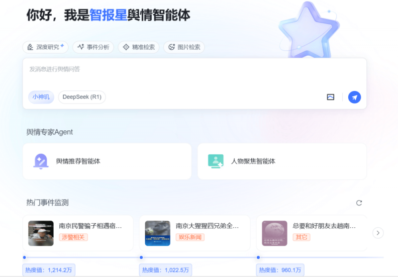 传统的舆情监测系统仍困于数据碎片、响应滞后与操作复杂的泥潭之中。中科天玑“智报星舆情智能体”依托十六年大数据技术积累,集成三大核心智能体,提供全方位、多模态、深语义的舆情治理能力: