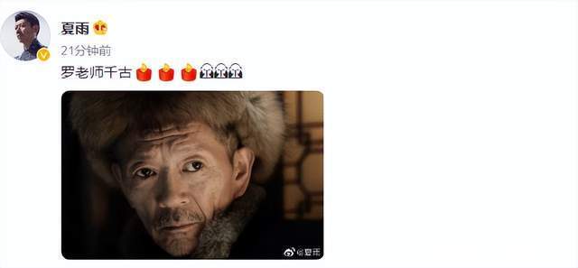 得知噩耗后,多位明星发文悼念。夏雨晒剧照发文:罗老师千古。夏雨与罗京民合作出演了电影《极寒之城》,影片即将上映。
