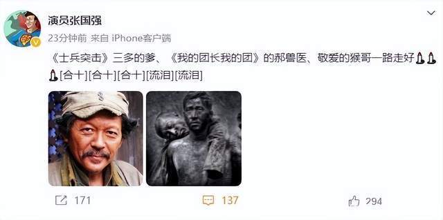 张国强发文悼念:《士兵突击》三多的爹、《我的团长我的团》的郝兽医、敬爱的猴哥一路走好。