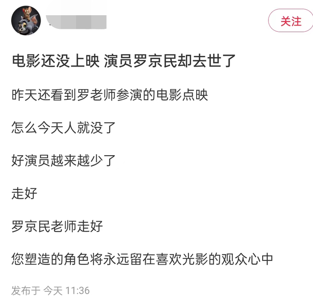有提前参加点映场的网友看到消息也感到突然,表示前一天还在看点映,隔天就听到离世消息,感叹好演员越来越少,祝罗老师一路走好。