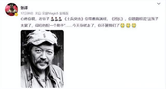 张译发文悼念:“心疼你啊,老爷子”,他表示在《士兵突击》里带他演戏,还记得在《团长》剧组里帮他申请助手,对老人家的离开有浓浓的不舍之情。