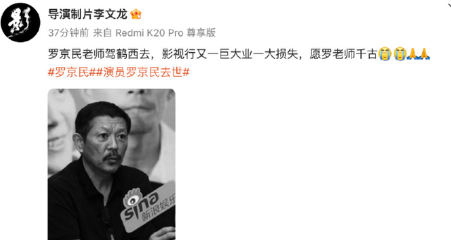 导演制片人李文龙也发文悼念,表示罗老师的离开是影视行业的又一巨大损失。